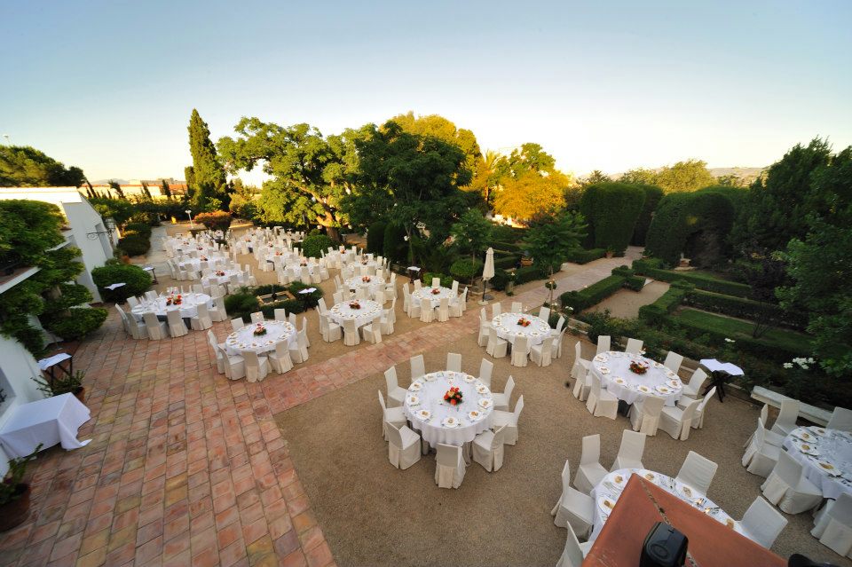 Panorámica exterior de jardines y zona de terraza de restaurante. En el suelo podemos ver suelo de terracota 30x30x2.